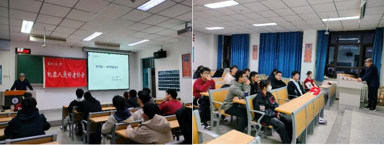 会上,刘二林老师强调了创新思维是学科竞赛的基石,并从工学类学科竞赛简介、学科竞赛在专业学习中的巨大作用、创新思维及其与学科竞赛的关系以及如何培养创新思维四部分,以通俗易懂的讲解方式向新成员们展示了创新思维在生活中的重要作用,例如在学科竞赛的专业学习中,创新思维能够深化理解与知识应用,培养团队合作与沟通技巧,并且可以激发研究兴趣,增强职业竞争力。刘老师还着重说明创意是一个多面性的概念,它涉及到产生新想法、解决问题、艺术表达等多个方面,在创意过程中,人们通常依赖于他们的想象力,直觉和批判性思维,并以“一个企业家可能通过创造一个新的商业模式来展示创意、一个科学家可能通过提出一个新颖的理论来展示创意”这个例子来证明创意的多样性,激励大家在生活的方方面面中多去想和思考新的创意。刘二林老师以其专业的素养和幽默的讲解风格,赢得了新成员们的阵阵掌声。新成员们在老师的讲解中,对机器人领域有了更深入的认识和了解,激发了大家对科技创新的兴趣与探索。整个活动过程轻松有趣,老师幽默和蔼可亲,新老成员之间互动频繁,气氛热烈。