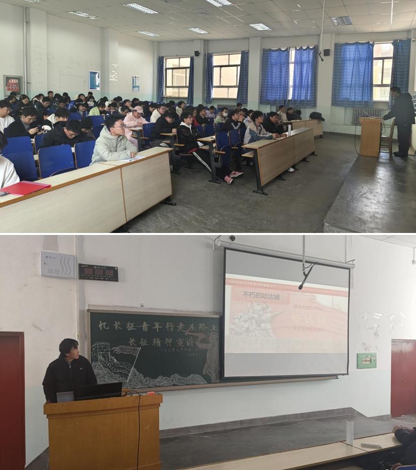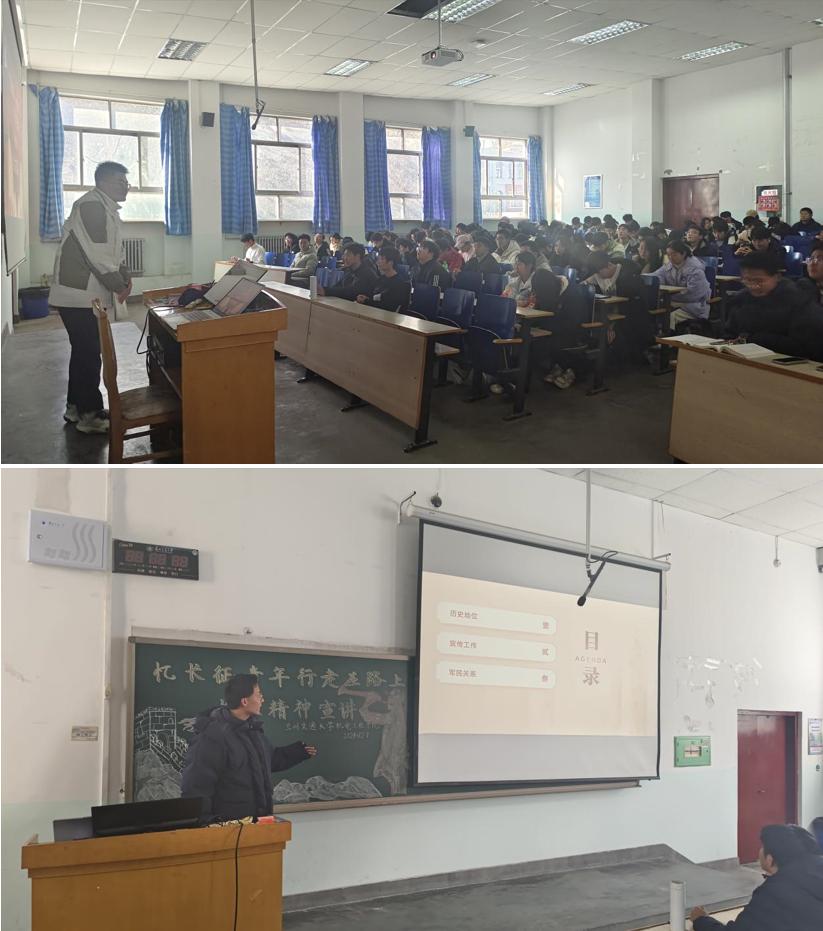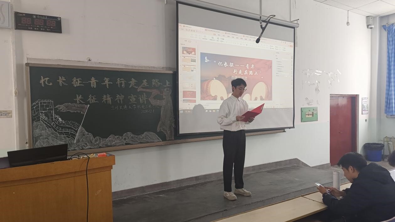 为深入传承长征精神,铭记光辉历史,激励广大青年奋勇前行,2024 年 11 月 24 日,学院青年志愿者协会举办了长征精神志愿宣讲活动。本次活动由李飞、魏祖豪、马玉华、赵旭飞四位同学担任主讲人,他们围绕长征途中的阿坝、腊子口、哈达铺、会宁四个关键节点,带领青年学子共同探寻长征精神的深邃内涵与磅礴力量。