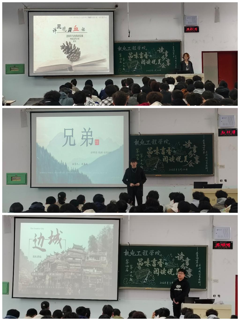 本次分享会上,三位同学分享了读书内容,交流了读书心得。王娇同学分享了作家余华创作的长篇小说《许三观卖血记》,小说以博大的温情描绘了磨难中的人生,以激烈的故事形式表达了人在面对厄运时求生的欲望,以平实的文字将生活的残酷与人性的温暖展露无遗,深深触动着每一位听众的心。刘嘉斌同学分享了作家余华创作的另一篇长篇小说《兄弟》,该书以用荒诞又真实的写作手法,将人性的善恶美丑无限放大,充分展现社会巨变中小人物的命运沉浮,让大家深刻感受到作者对六七十年代强权的批判,以及对改革开放初期民众精神生活匮乏的担忧和对人民的人性关怀。张泽成同学分享了作家沈从文创作的中篇小说《边城》,该书以兼具抒情诗和小品文的优美笔触,描绘了20世纪30年代湘西地区特有的风土人情,以船家少女翠翠的纯爱故事,展现出了人性的善良美好。三位分享者不仅对书籍内容进行了清晰的阐述,也分享了对书籍主旨的独特见解与自身思考,赢得了听众的阵阵掌声。
