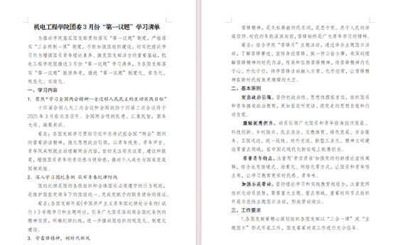 为落实“第一议题”制度和“三会两制一课”制度,强化团组织建设,切实把理论学习作为增强团员青年理论素养、激发团支部活力的重要基础,2025年3月18日至3月23日,学院团委组织各团支部开展了3月“第一议题”集中学习。