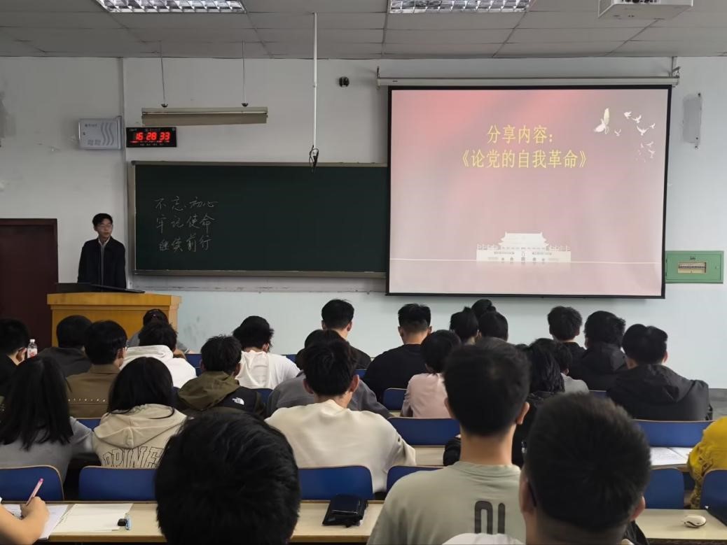 紧接着,青马第一小组学员高国章以“论党的自我革命”为题,作了精彩的学习分享。他首先从“勇于自我革命是党最鲜明品格”这一视角出发,深入阐述了党在历史进程中不断自我革新、自我提升的伟大历程;随后,他围绕“党的政治建设是党的根本性建设”这一核心论点,阐述了政治建设对党的引领作用及其对青年学子的深刻启示;在“把思想建设作为党的基础性建设”部分,他倡议团员青年应端正思想态度,尤其是入党动机的纯洁性,明确共产党员的责任与担当,坚决摒弃功利之心。此外,他还结合“作风建设永远在路上”、“夺取反腐败斗争压倒性胜利”等内容,为学员们分享了自己的见解。高国章同学的分享内容丰富、逻辑严密,引发了现场学员的热烈讨论与深入思考。