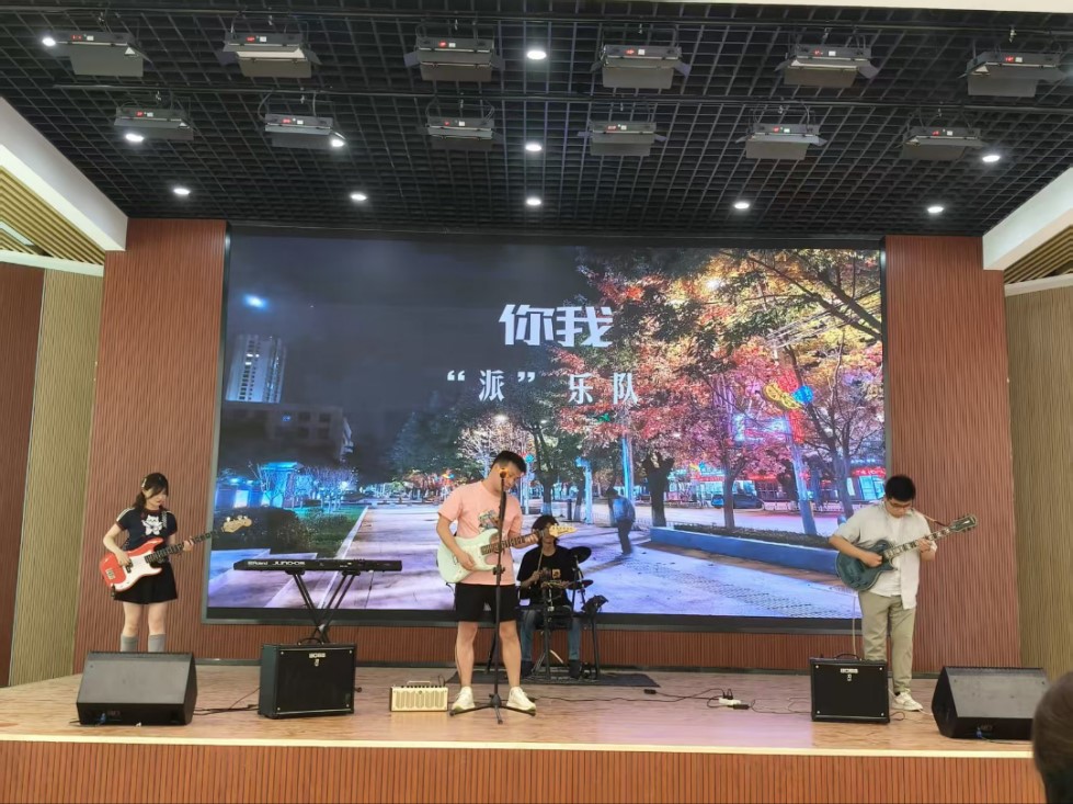 活动伊始,大学生艺术团乐队便以《8+8=8》点燃现场,鼓点与吉他交织出热血节奏,旋律如电流穿透耳膜,鼓鼓声浪深深触及人心灵深处;《河流》更是凭借主唱裹挟情感奔涌的嗓音与动人的歌喉,瞬间将舞台化为音乐磁场,博得观众的阵阵掌声。接着,车辆2306班乐队用《你我》诠释青春羁绊,主唱声线温柔又充满力量,副歌部分和声渐强,电吉他的声音相互碰撞,鼓点激昂却又不紊乱,仿佛在诉说少年心事里的共鸣,简单的歌声里藏着不简单的默契。