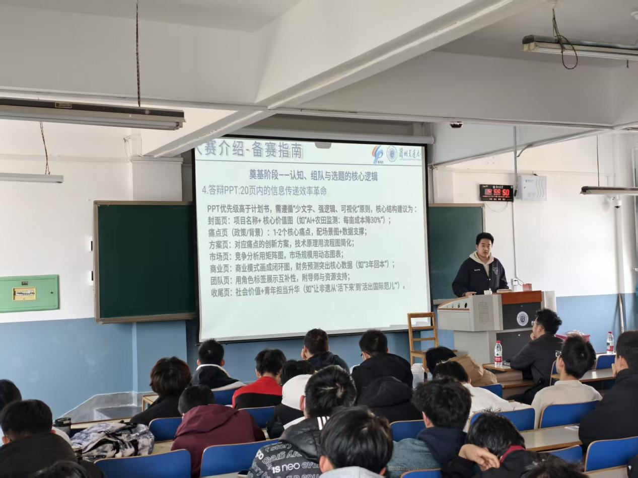 “优秀的项目需要清晰的规划和团队的协作。”贺中牧从团队组建、时间管理、项目推进等角度分享了备赛经验。他建议团队成员要分工明确,各展所长,同时要制定详细的备赛时间表,确保项目有序推进。在答辩准备方面,他特别提醒要注意PPT的逻辑性和美观性,重点突出项目的创新性和应用价值。交流环节,同学们围绕项目选题、团队建设、资源获取等问题踊跃提问,石壮老师和贺中牧同学详细介绍了学院对竞赛的支持政策,表示将提供实验资源、指导教师和经费保障,以及项目孵化场地和设备支持,帮助同学们将创意转化为实际成果,鼓励同学们积极参赛。