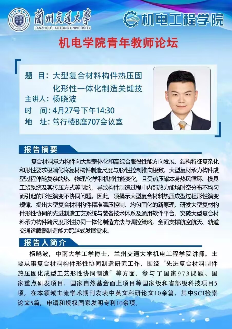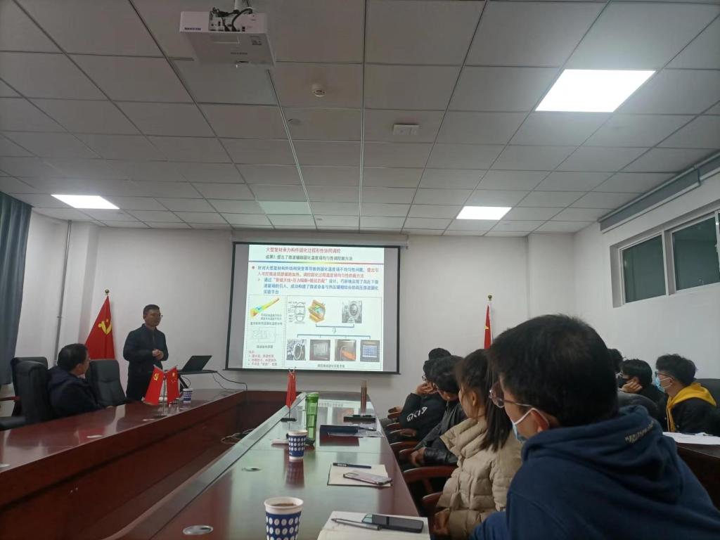 杨晓波博士的报告题目为“大型复合材料构件热压固化形性一体化制造关键技术研究”,报告以大型航空复合材料承力制件的高质高效形性协同成型制造为对象,围绕大型构件复杂结构特征在固化成型制造中存在的热力能场复杂、形性缺陷机理不明和形性演变协同控制难度大等关键技术问题展开,详尽阐述了构建大型复材构件热压固化成形过程多参数协同在线监测系统、建立大型复材构件固化成形过程多系统多场耦合形性演变预测模型、给出大型复合材料构件精准温压控制、均匀固化的新方法等内容,所得研究成果对我国新一代高速列车装备轻量化研发具有借鉴意义。