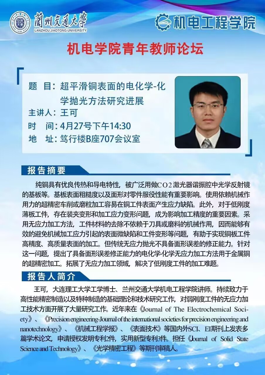 王可博士的报告题目为“超平滑铜表面的电化学-化学抛光方法研究进展”,针对低刚度薄板工件机械加工过程中存在的装夹变形和加工应力变形等关键技术问题展开,详尽阐述了用于低刚度薄板超精密加工的电化学-化学无应力抛光方法,所提方法具有面形误差修正能力,有效避免了机械加工应力引起的表面微缺陷和工件变形等问题,其研究成果解决了低刚度工件加工关键技术问题,实现了低刚度铜板工件的高精度、高质量表面加工,拓展了无应力加工领域。