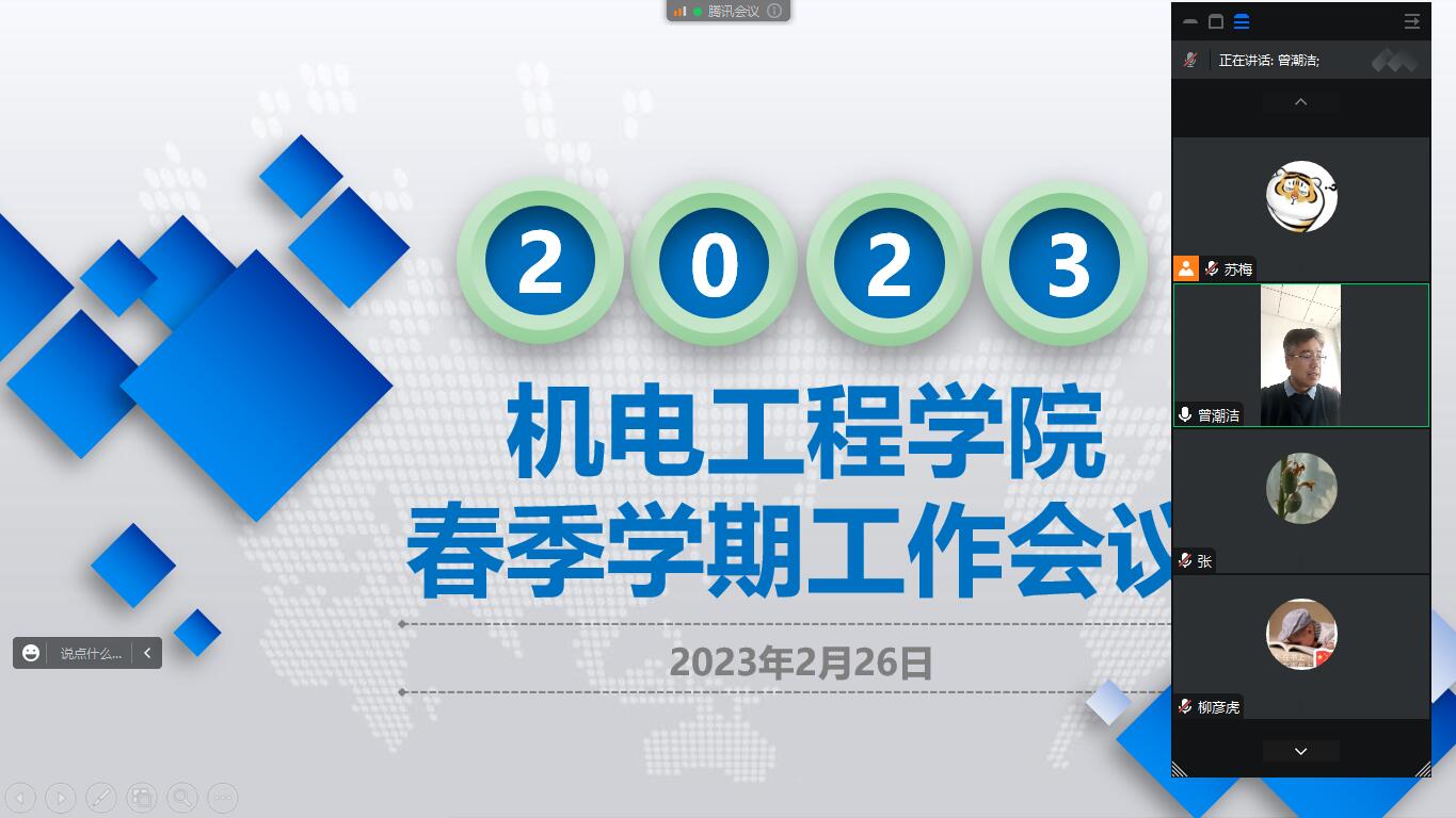奋楫扬帆正当时,砥砺前行再出发。为进一步统一思想、振奋精神,扎实做好2023年春季学期工作,2月26日,机电工程学院召开2023年春季学期工作会议。学院领导班子成员和学院全体教职工参加会议,会议由学院党委书记曾潮洁主持。
