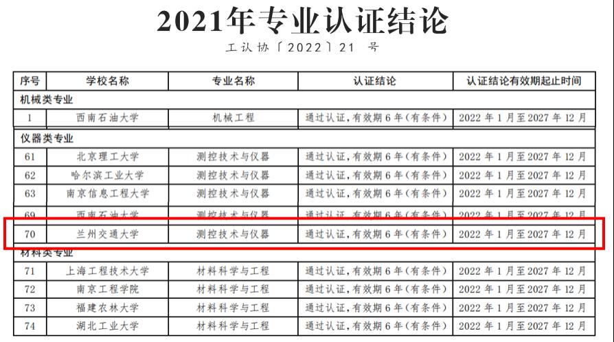 近期,中国工程教育专业认证协会公布了2021年工程教育专业认证通过名单,经过学校自评、自评审核、专家组现场考查、结论审议等程序,我院测控技术与仪器专业顺利通过工程认证。