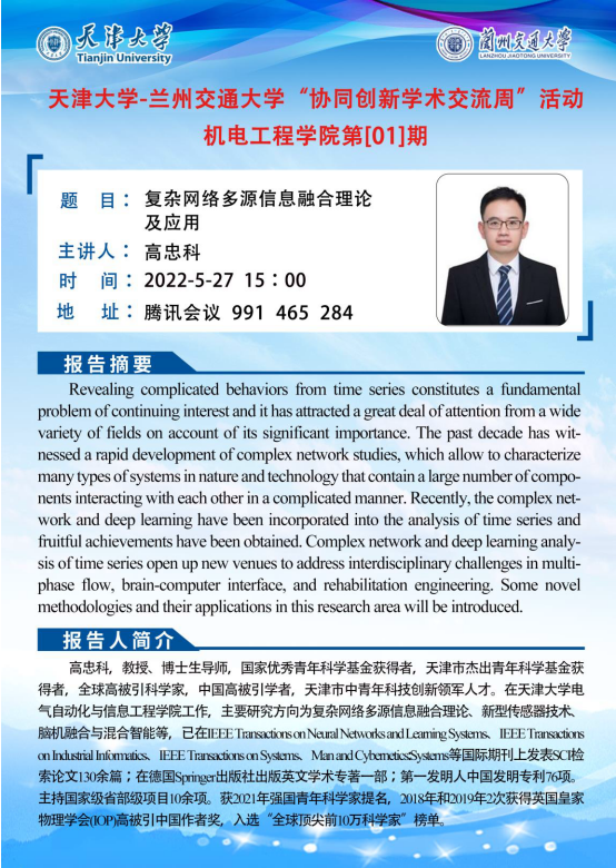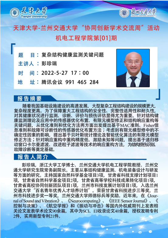 为促进我校师生的学术交流,科技处组织了天津大学-兰州交通大学“协同创新学术交流周”活动,我院特邀请天津大学教授、博导高忠科、刘玉红和兰州交通大学教授、博导彭珍瑞三位老师,与两校师生进行学术交流。具体时间为5月27日下午15:00-18:00,地点为腾讯会议991 465 284。