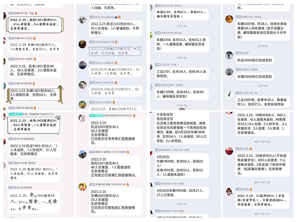 工作群定时报告。每天晚上10:30之前宿舍长自查并向班长上报宿舍人数,11:00班长逐一巡查本班每间宿舍,11:20班长在年级班长群按照规定格式向辅导员报告班级宿舍人数,11:30辅导员在学工办群报告年级情况,通过采取多个工作群逐级报告,真正做到了底数清情况明,数据真实准确,心中了如指掌。