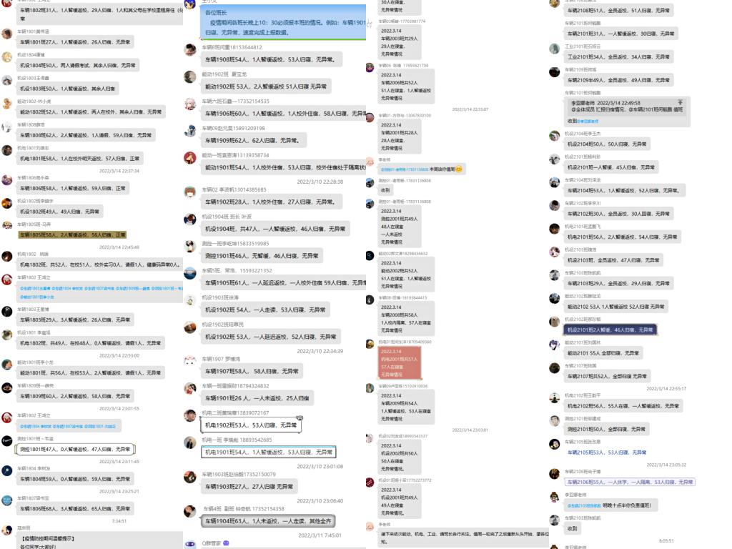 上下精细联动,下好疫情防控“制胜棋”。为扎实做好疫情防控工作,学院建立每日动态报告工作机制,坚持落实“日报告、零报告”制度,全面摸排学院教职员工和全体学生情况,建立健康档案,确保及时准确掌握师生动态。对于学院教职工,建立系(中心)、主任定期汇报制度,对本系(中心)教师情况进行摸排汇总,并及时汇报;对全体学生,以年级、班级为单位,建立辅导员—主要学生干部—全班学生的疫情防控信息网,每日排查班级同学身体健康情况并汇总上报,实时掌握全院学生情况,并及时通过网络宣传、群发通知等方式号召同学们响应国家和学校号召,服从当地、学校、学院疫情防控工作安排,居家做好科学抗疫的带头者。