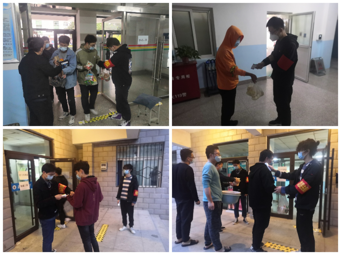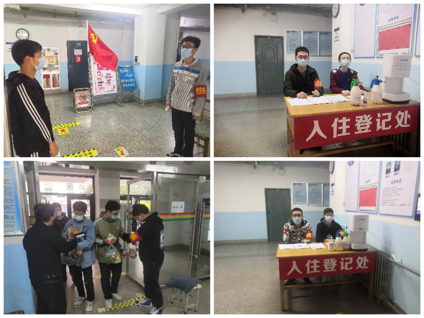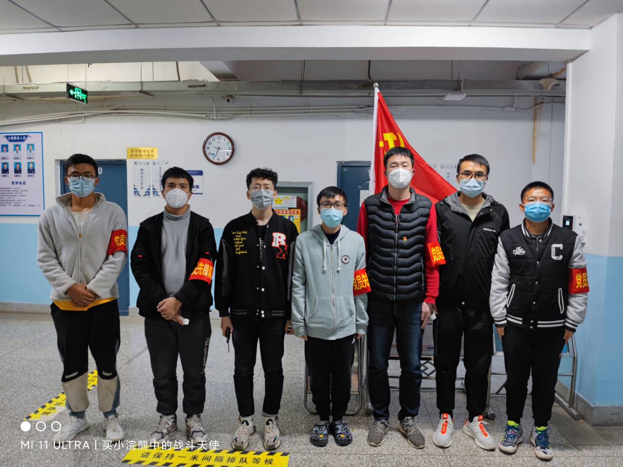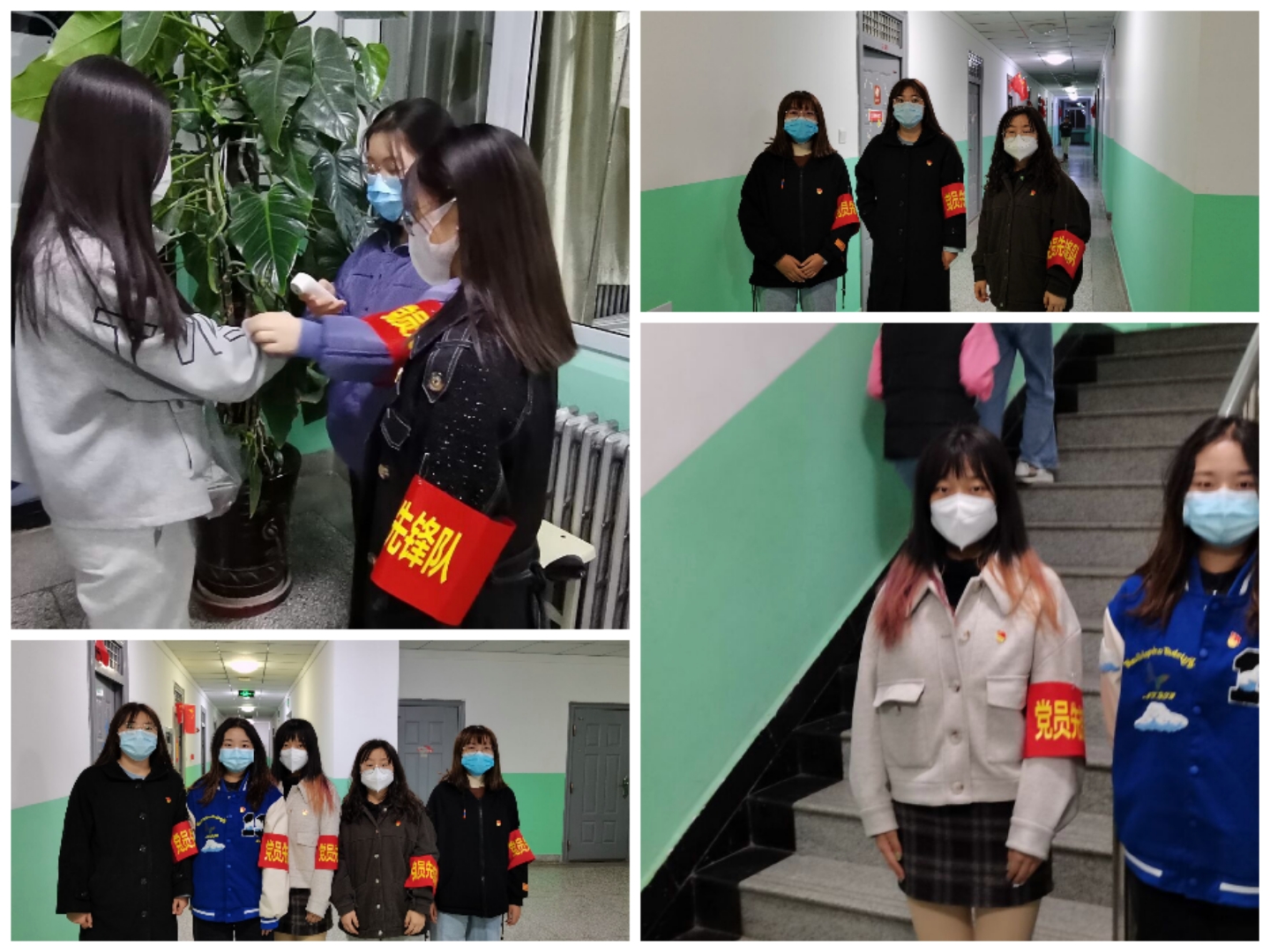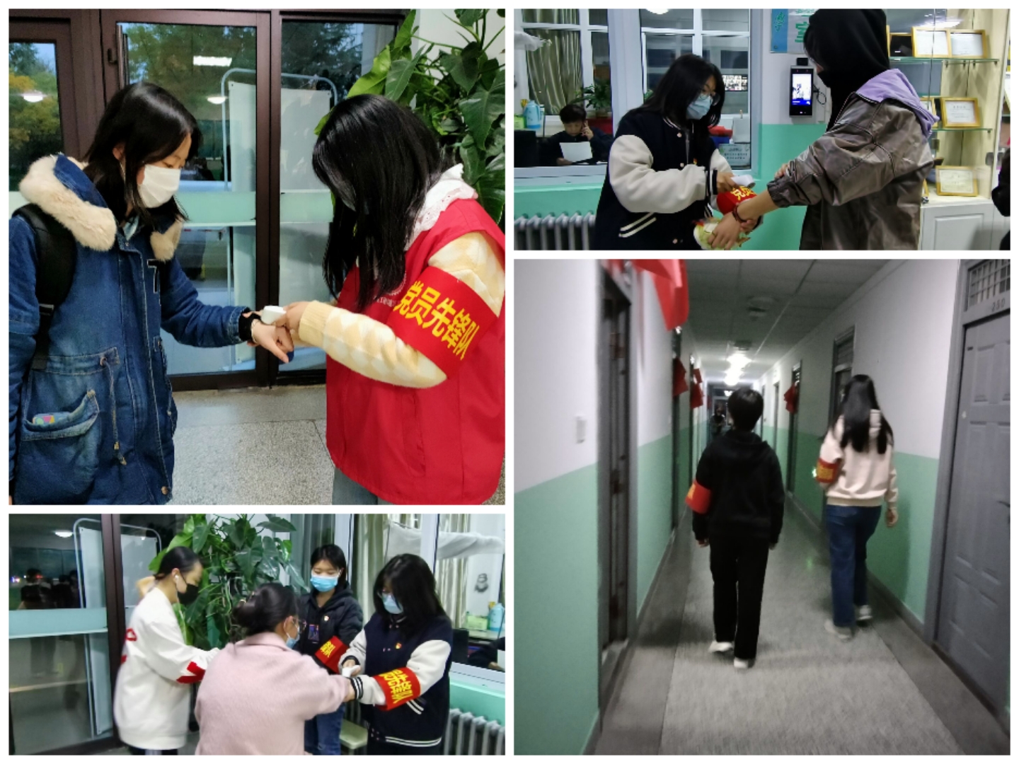 学院“党员先锋队”在严格遵守学校疫情防控要求和做好自我防护的前提下,前往学生公寓北苑6号楼、北苑7号楼、南苑5号楼参与疫情防控,全力协助宿舍管理人员测温验码、人员登记和处理突发状况,劝导学生不要在楼内公共区域聚集扎堆、要保持宿舍、楼道以及厕所卫生干净,督促同学出入宿舍、食堂、校园活动一定要佩戴好口罩,提醒学生做好自我防护,既当“服务员”,又当“宣传员”,以实际行动坚决扛起疫情防控政治责任,让党旗在疫情防控一线高高飘扬。