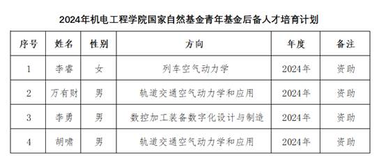 为加快青年博士人才的培养,提高机电工程学院青年人才的科研水平和创新能力,学院从2024年开始设立“机电工程学院国家自然基金青年基金后备人才培育计划”,2024年遴选4人获得首批资助。