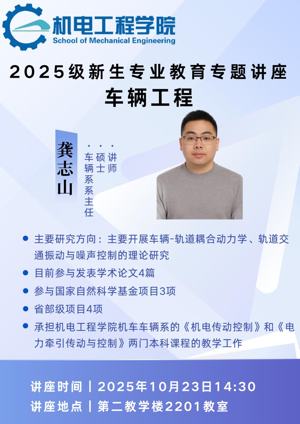 为帮助2025级车辆工程专业新生深入了解专业内涵、明确学习方向、树立远大目标,2025年10月23日14:30,学院在第二教学楼2201教室举办了车辆工程专业认知教育专题讲座。本次讲座由学院车辆工程系系主任龚志山老师主讲,学院2025级全体车辆工程专业新生参加。