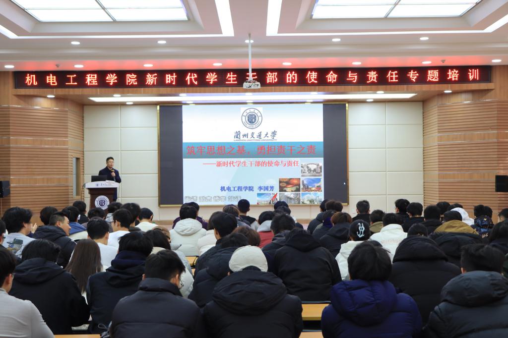为切实发挥学生干部在思想政治引领与学生管理服务中的桥梁纽带作用,通过系统化、专题化培训全面提升学生干部的政治素养、综合履职能力与奉献服务意识,着力锻造一支政治坚定、能力突出、作风过硬的新时代高素质学生骨干队伍,2025年12月4日下午2:30,学院在第二教学楼报告厅组织召开“铸牢思想之基•勇担骨干之责——新时代学生干部的使命与责任”专题培训大会。学院党委书记李国芳为2023-2025年级的班长、团支书、生活委员和防诈宣传员约200余名学生干部作专题授课。培训由学院学生工作办公室主任胡瑶主持。
