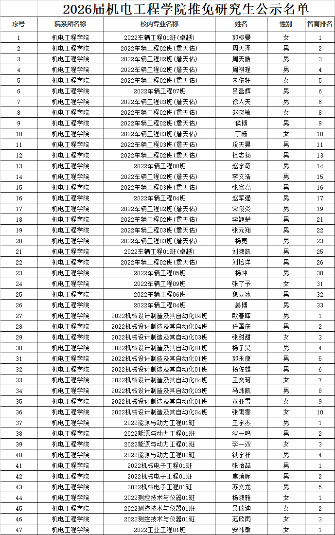 根据《兰州交通大学2026届优秀应届本科毕业生推荐免试攻读硕士学位研究生工作实施方案》和《机电工程学院2026届优秀应届本科毕业生推荐免试攻读硕士学位研究生工作方案》等文件相关规定,学院坚持公平、公正、公开的工作原则,经过审核,现将2026届推免名单公示。公示期为2025年9月5日-2025年9月7日。如果对公示内容有异议,请在公示期间及时反馈。电话:0931-4956273